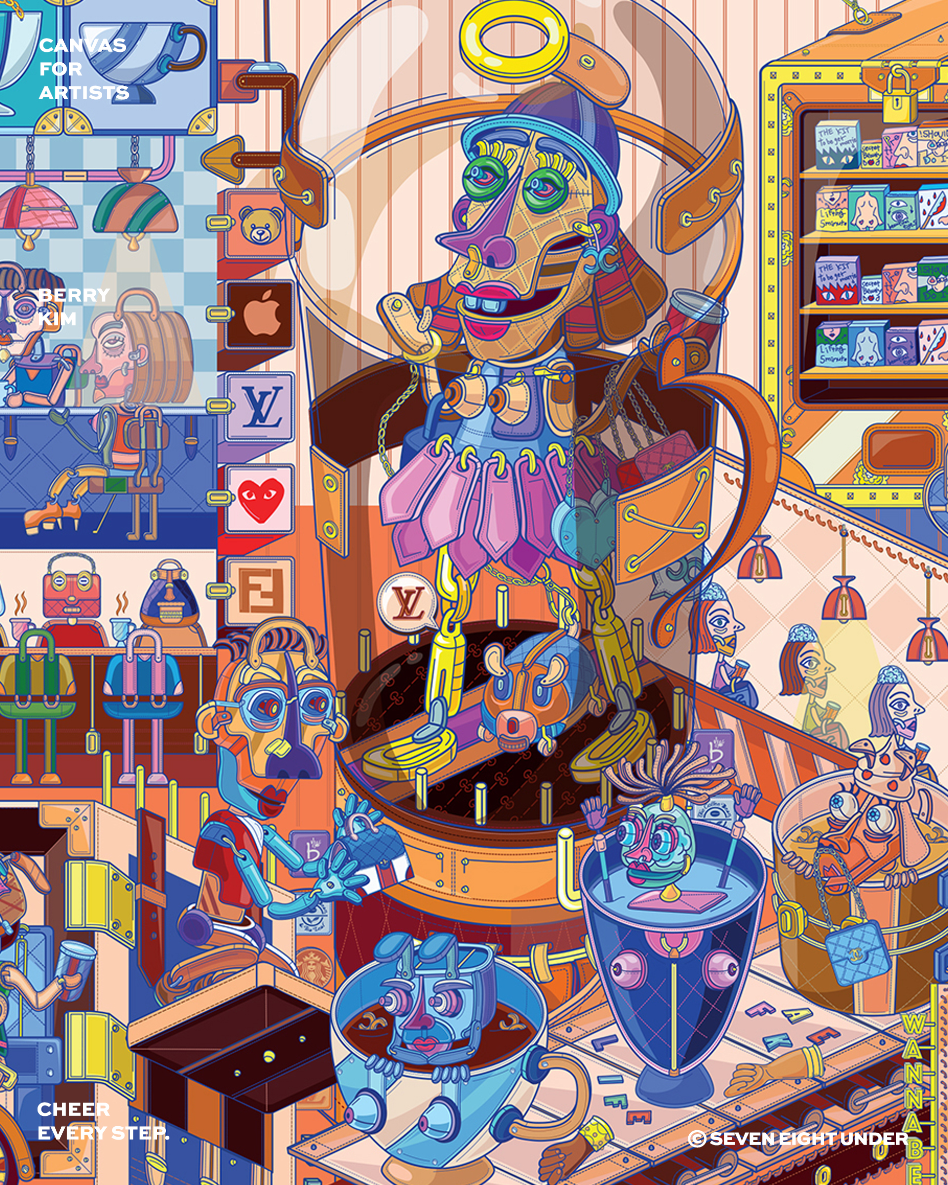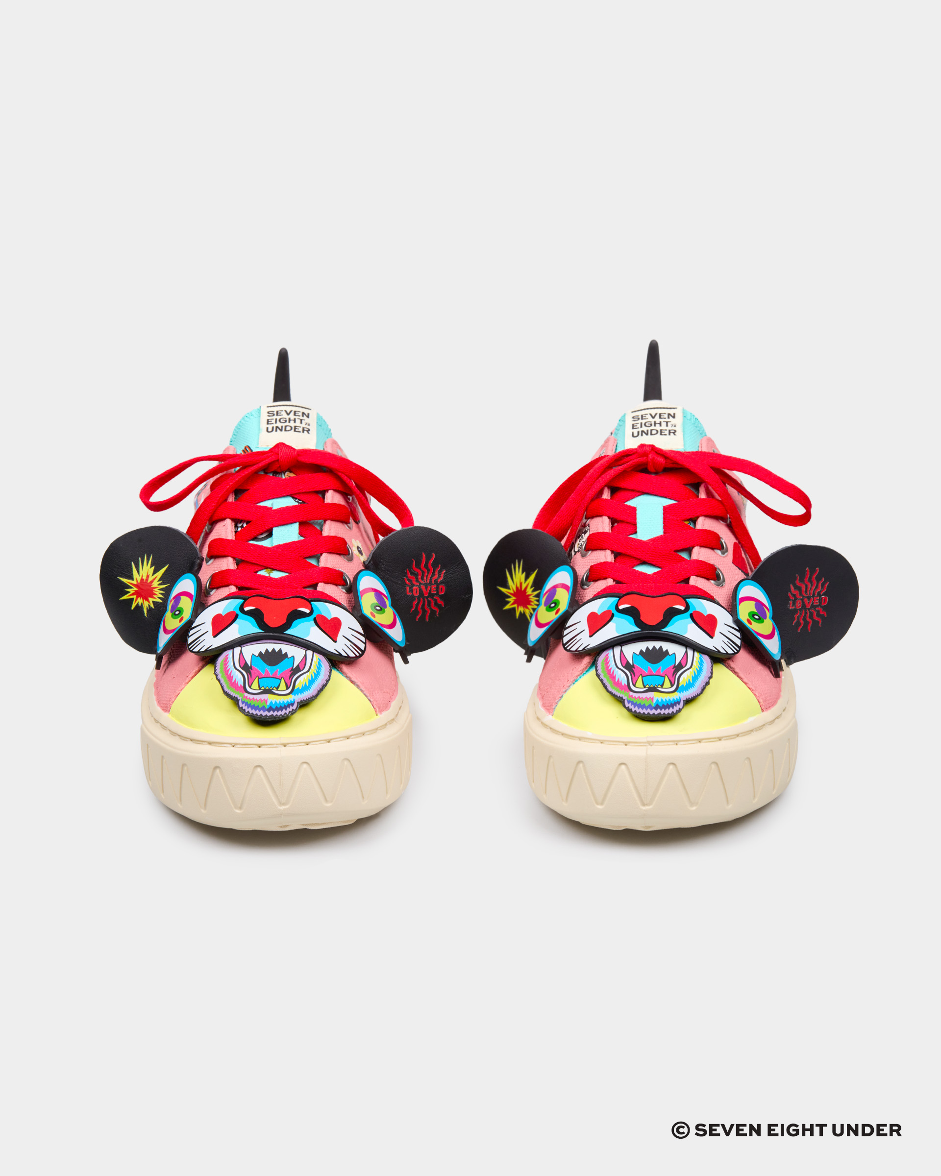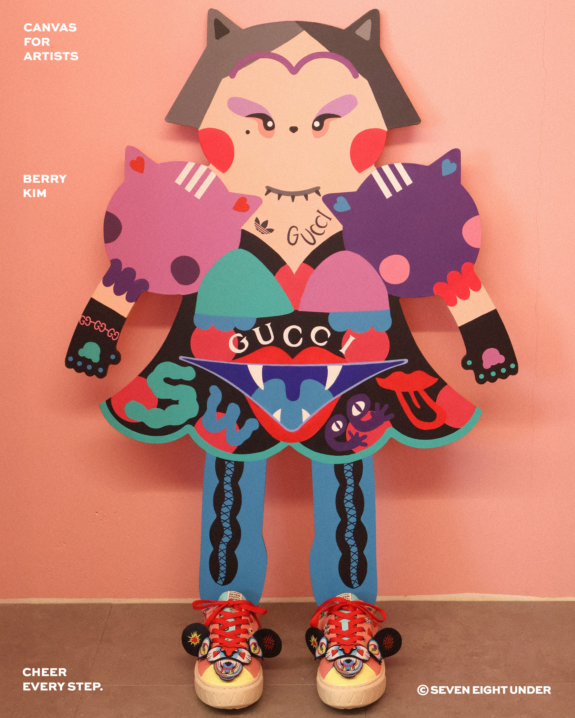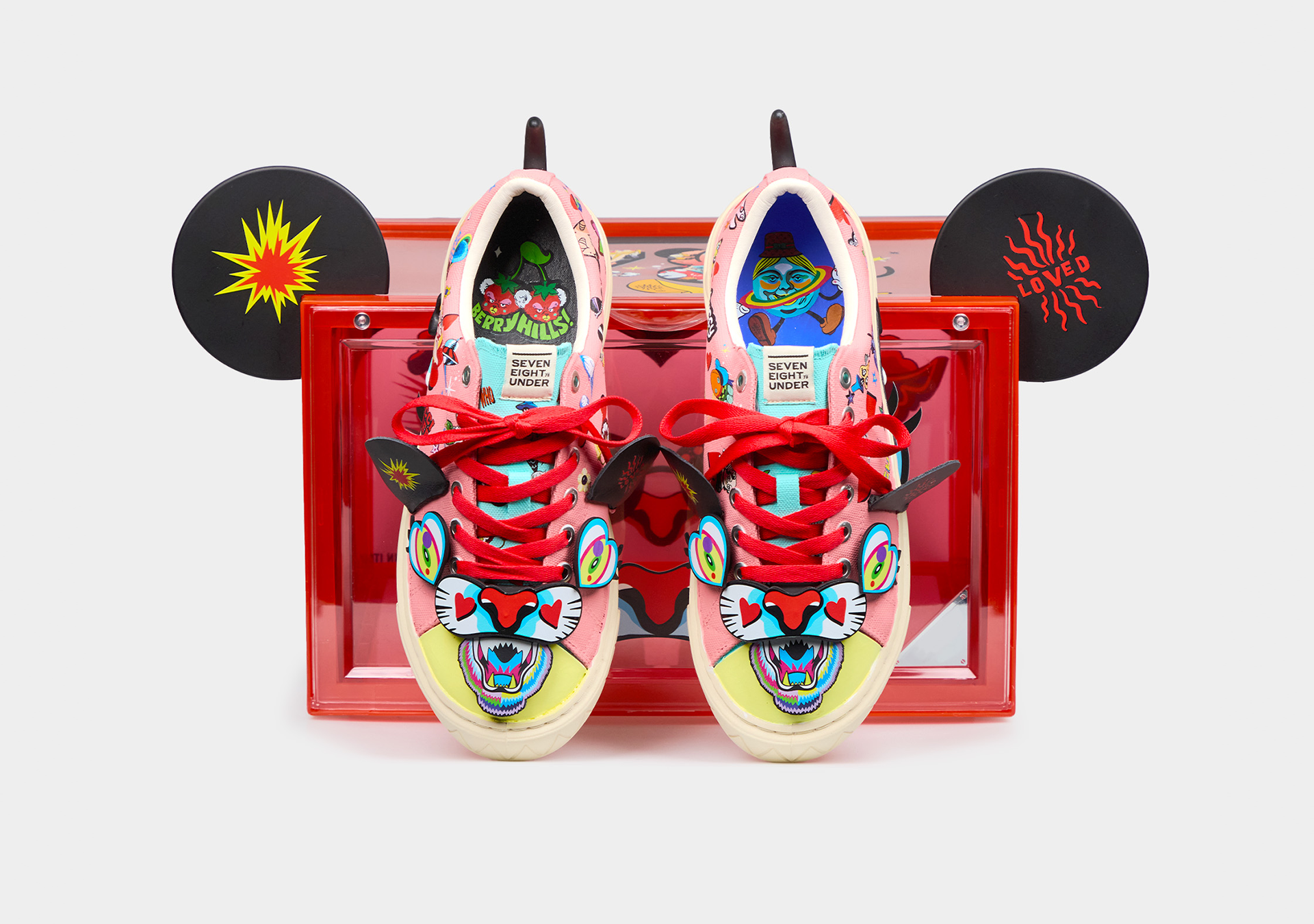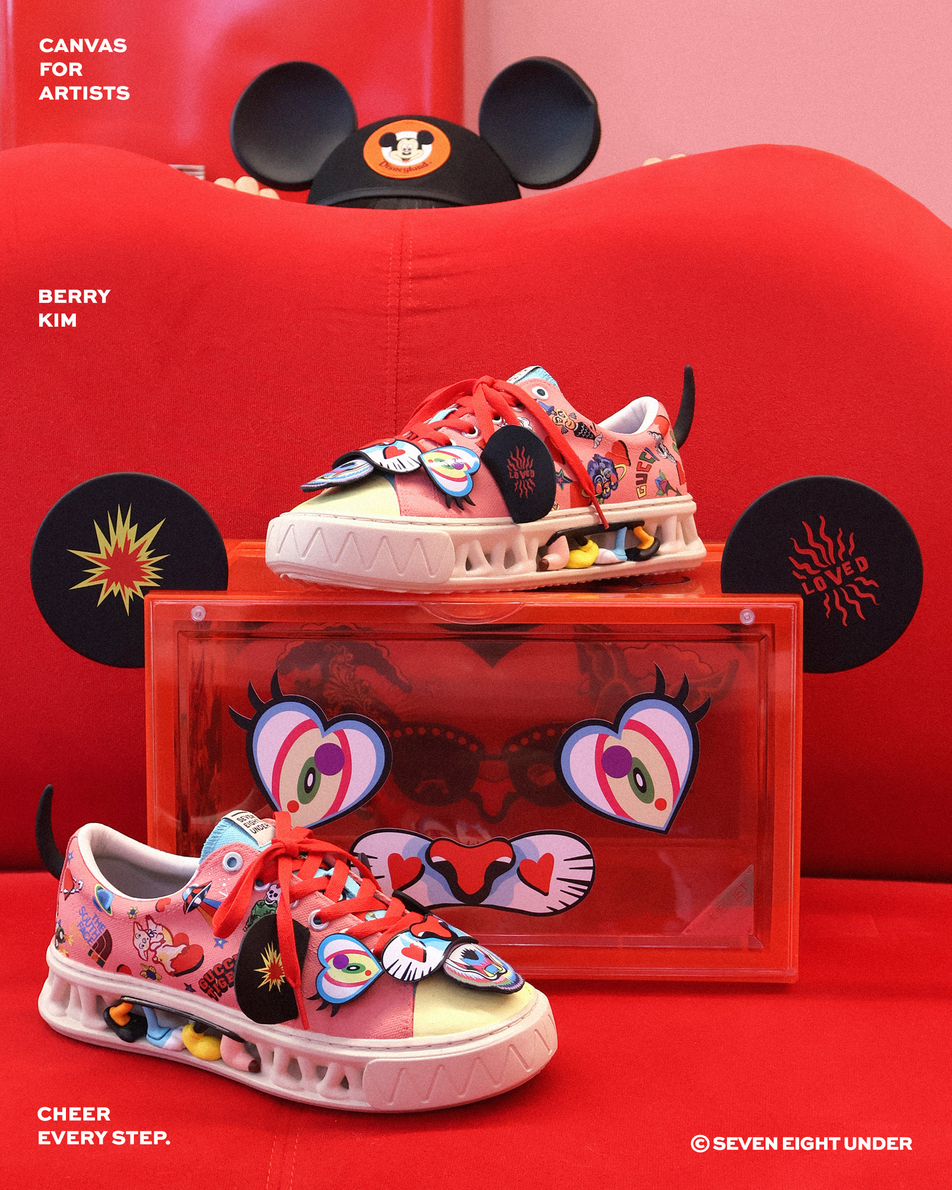 베리킴은 현대 소비문화의 기이한 풍경, 바로 '오픈런(Open Run)'에 주목했어요. 경제 불황에도 불구하고, 희소성과 '소유의 상징성'을 가진 제품에 열광하는 현대인들의 심리 '더 빠르고, 더 비싸고, 더 있어 보이는 것'을 향한 집단적 욕망을 보여주고 있죠. 이 작업은 팝아트의 전형적 요소인 유명 캐릭터와 명품 브랜드를 적극적으로 차용하고 패러디함으로써, 허황된 아름다움과 소비의 속도전을 유머와 풍자로 풀어낸 작품이에요. 익숙한 미키마우스의 형상은 세븐에잇언더의 신발을 통해 재해석되어, 'Beckie Mouse'라는 새로운 페르소나로 탄생했어요. 신발을 모티브로 삼아 재탄생한 이 캐릭터는 네 개의 발로 분주히 달리는 모습으로 표현되며, '소유의 욕망을 향한 오픈런'이라는 현대인의 소비 심리를 시각화하고 있어요. 마치 이 신발을 신는 순간, '누구보다 빠르고 높고 멀리 도달할 수 있을 것 같은 착각' 그 자체가 이 작업이 조명하는 환상이에요. 세븐에잇언더의 역동적인 디자인은 이러한 베리킴의 가치관과 결합되어, 단순한 패션 아이템을 넘어 동시대 소비문화에 대한 시적 비평으로 확장되었어요.